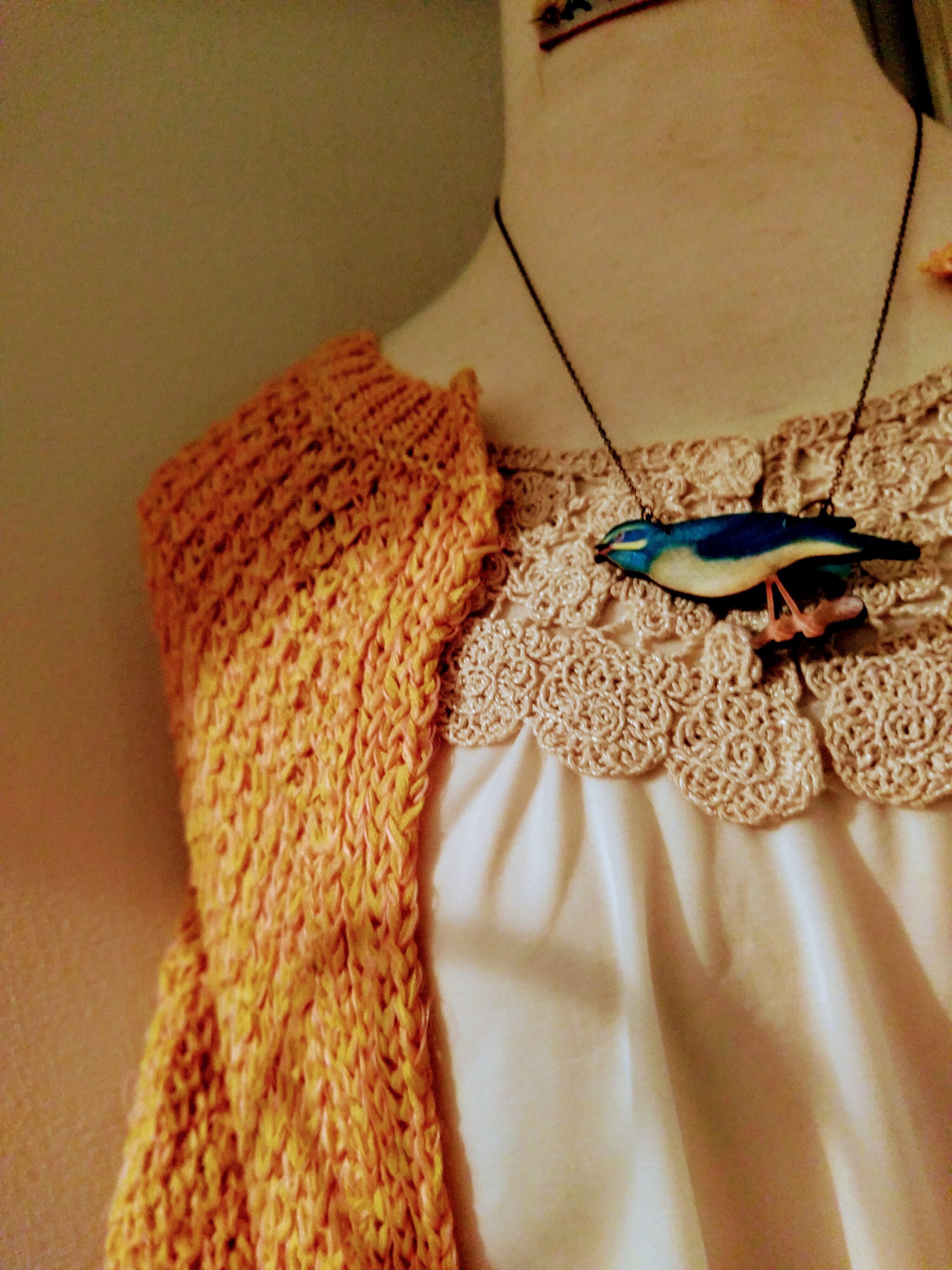 ※鳥は木の素材、青いお花のチャームがついています。チェーンの色はダークブラウン、長さ約45cm。鳥全長は約6.5センチ。とても軽量に装着できるネックレスです。