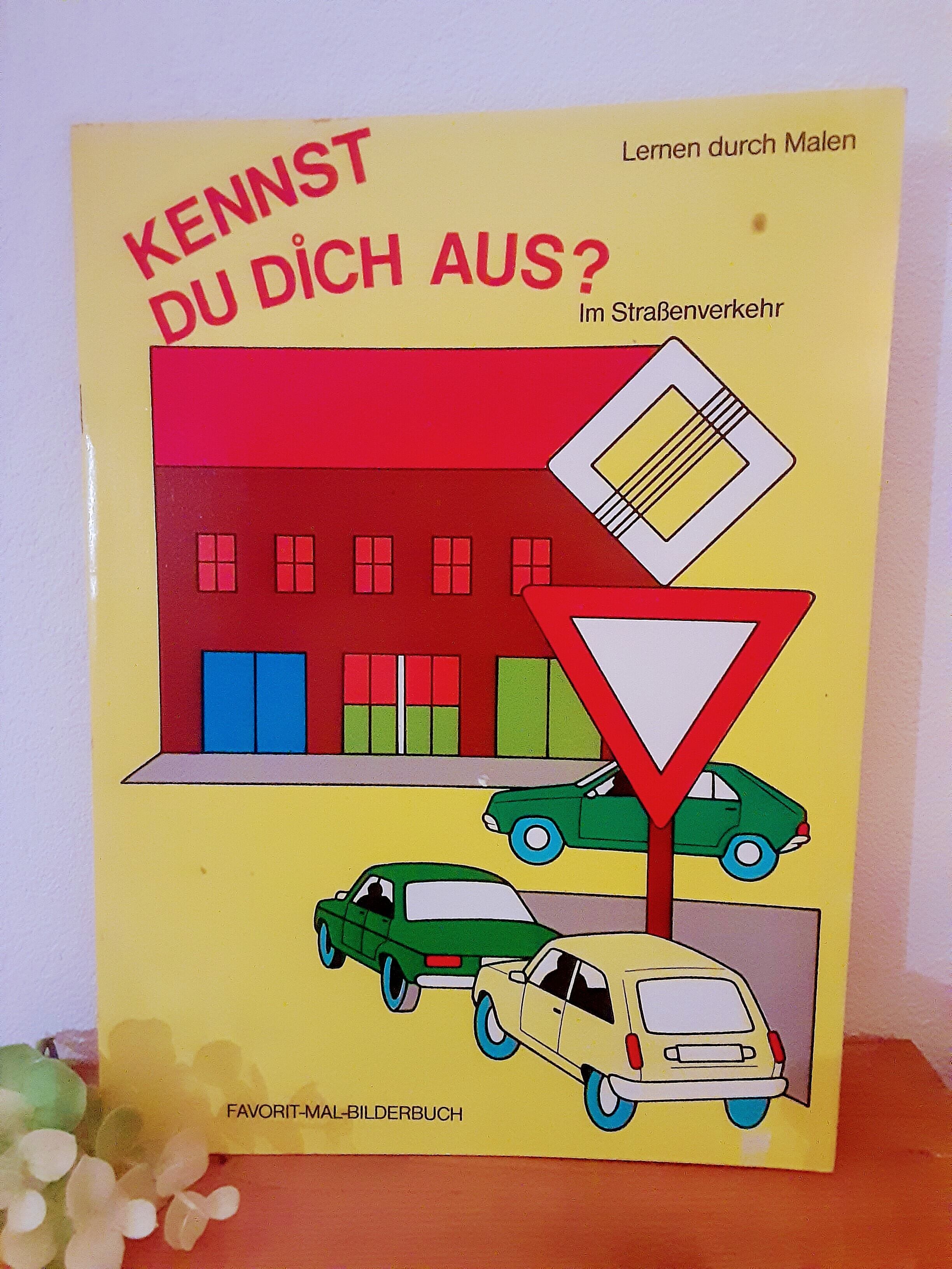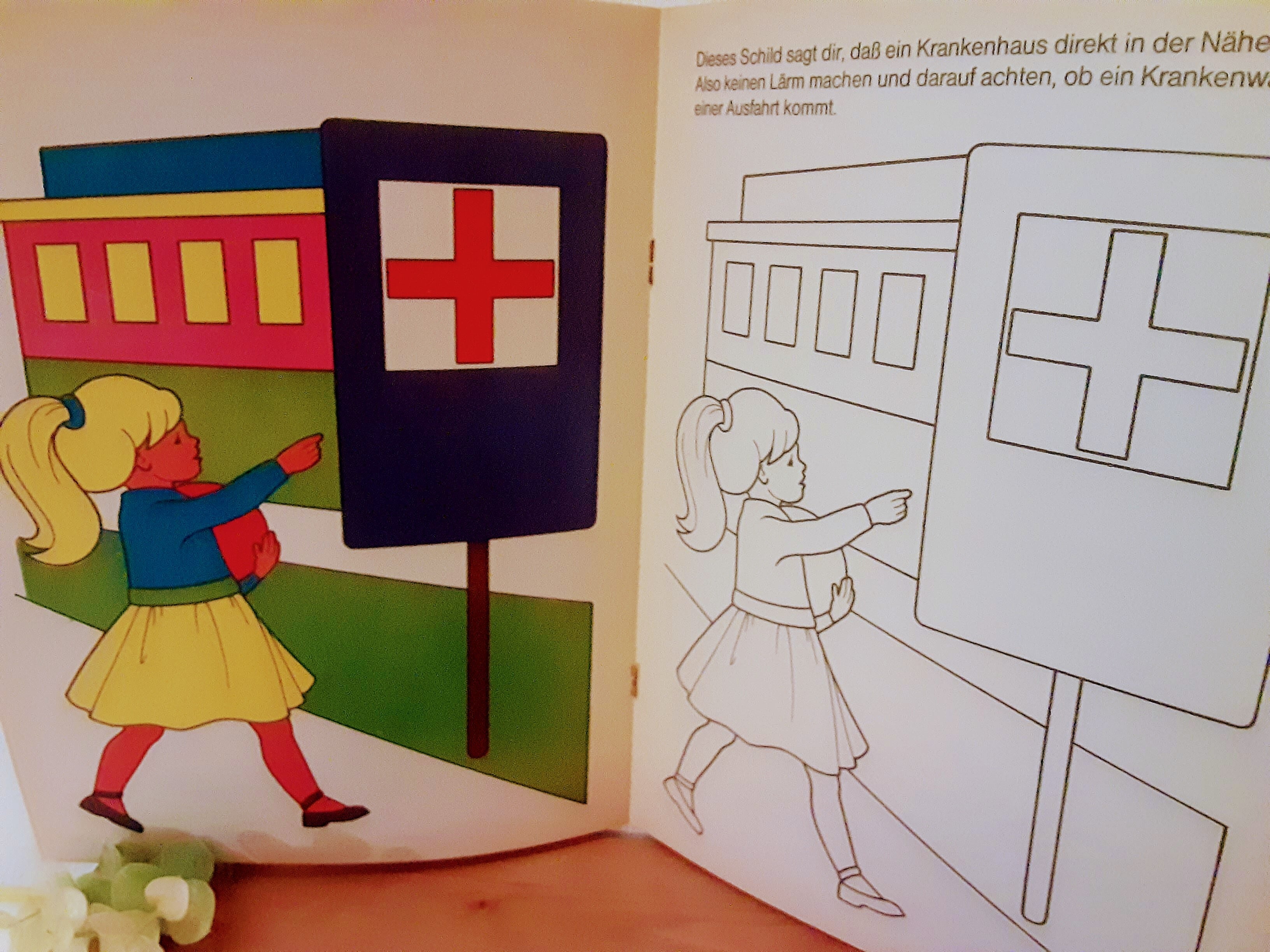この標識知ってる?とドイツ語で投げ掛けられて始まる可愛いイラストが魅力のドイツのぬりえ本です。
